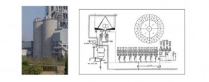 CP均化庫(kù)是我廠引進(jìn)德國(guó)BMH公司的一種新型生料均化庫(kù),其特點(diǎn)電耗低、均化效果好。CP均化庫(kù)的均化機(jī)理是庫(kù)頂生料通過(guò)8條斜槽均勻布料,不同時(shí)期的生料在庫(kù)內(nèi)呈橫向分布,庫(kù)底充氣系統(tǒng)設(shè)計(jì)更符合生料充氣后的流動(dòng)性,呈放射狀斜向分布,環(huán)形區(qū)一般分8個(gè)區(qū),每隔5分鐘輪流充氣,充氣區(qū)生料因松動(dòng)及氣流的引導(dǎo)卸入中心區(qū),庫(kù)內(nèi)不同層的生料豎向切割下料實(shí)現(xiàn)生料的均化,不同時(shí)間的生料進(jìn)入中心區(qū)后再進(jìn)行氣體強(qiáng)烈混合均化,從而達(dá)到理想的均化效果。